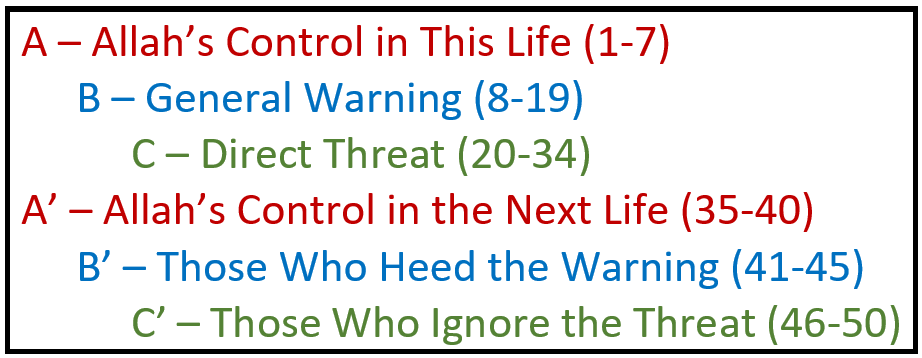 In A’, Allah ﷻ describes His control on the Day of Judgment. No one shall speak without His permission and the only plan to be executed on that Day is His plan. The two passages are also linked through their usage of two words that share the same root letters for the word, “excuse”. In A, Allah ﷻ says that after one is confronted with revelation, there will be no more excuses (ʿudhran). And in A’, Allah ﷻ tells us that no one will be permitted to offer excuses (yaʿtadhirūn) on the Day of Judgment.