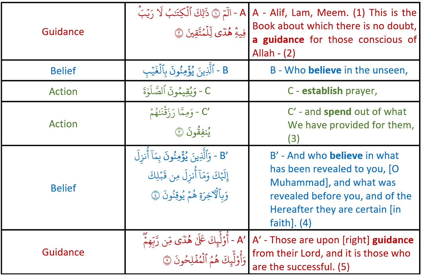 With the above in mind, let us observe how the first five āyāt of Sūrah al-Baqarah are organized: