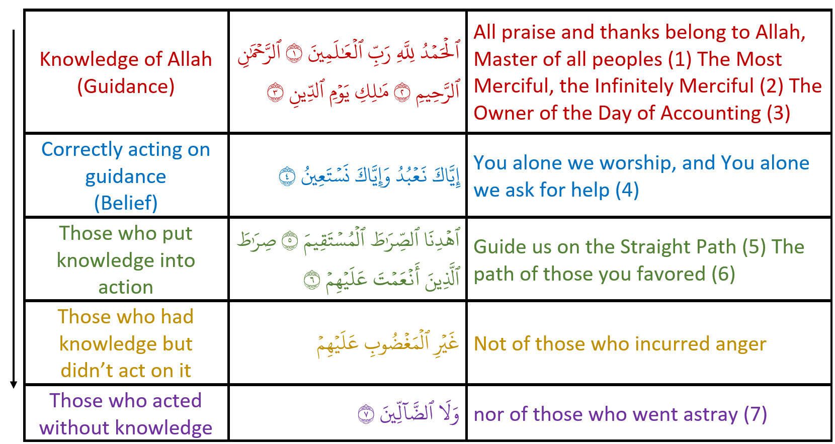 In our post on Sūrah al-Fātiḥah one aspect we didn’t examine was the linear coherence of the sūrah. Below you will find a summary of how the themes of the sūrah progress: