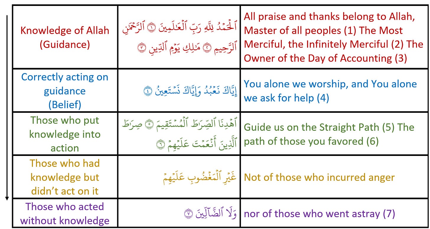 We see that Sūrah al-Fātiḥah begins with knowledge about Allah ﷻ. Knowledge, when it comes from Allah ﷻ may also be labeled as “guidance”. Next the sūrah progresses to two statements labeled as “Correctly acting on guidance” which can be summarized as “belief”. The rest of the sūrah then outlines the possible ways knowledge and action can be applied. We can choose to be of (1) the “favored” who applied their knowledge into appropriate action (i.e., become believers), (2) those who have guidance and reject it or (3) those who act without proper knowledge.