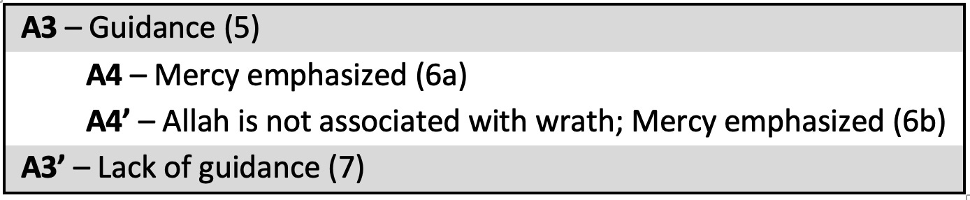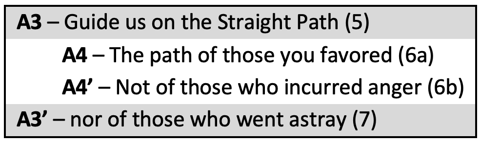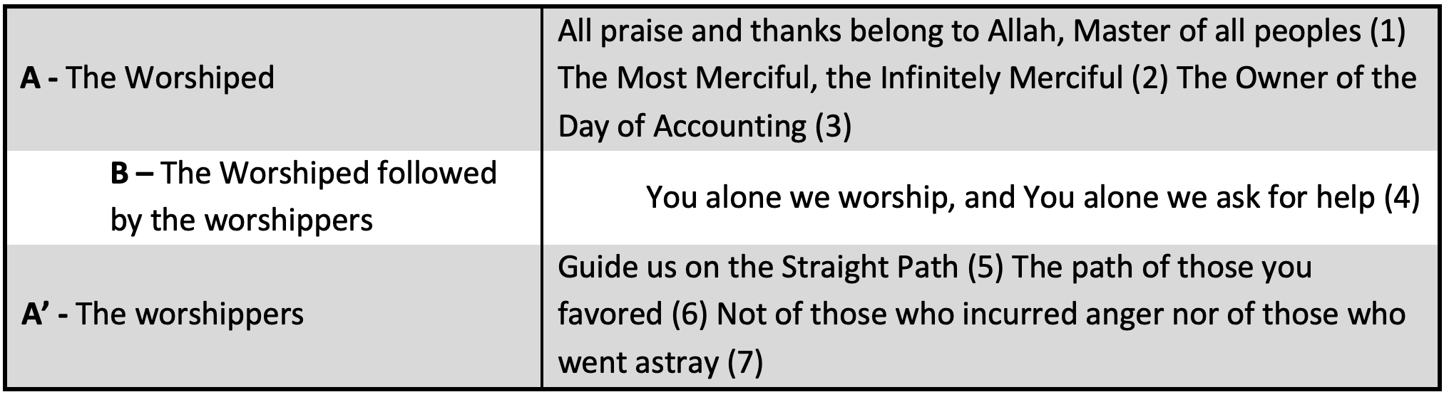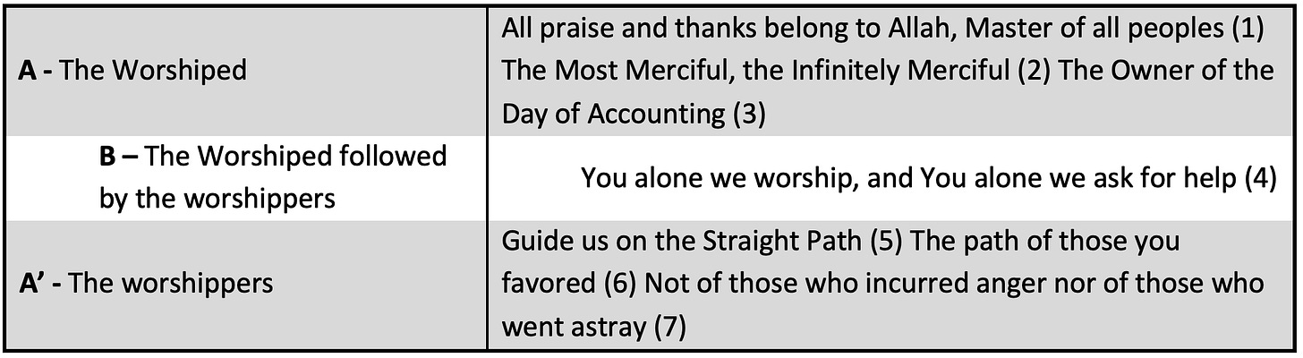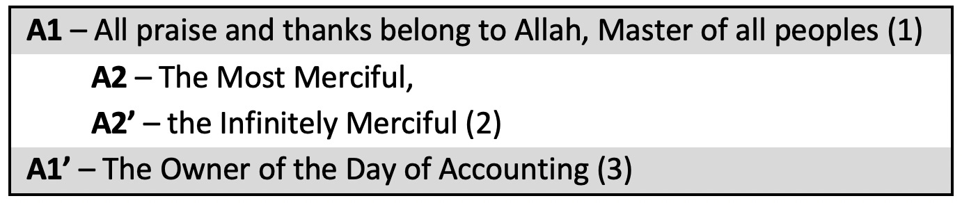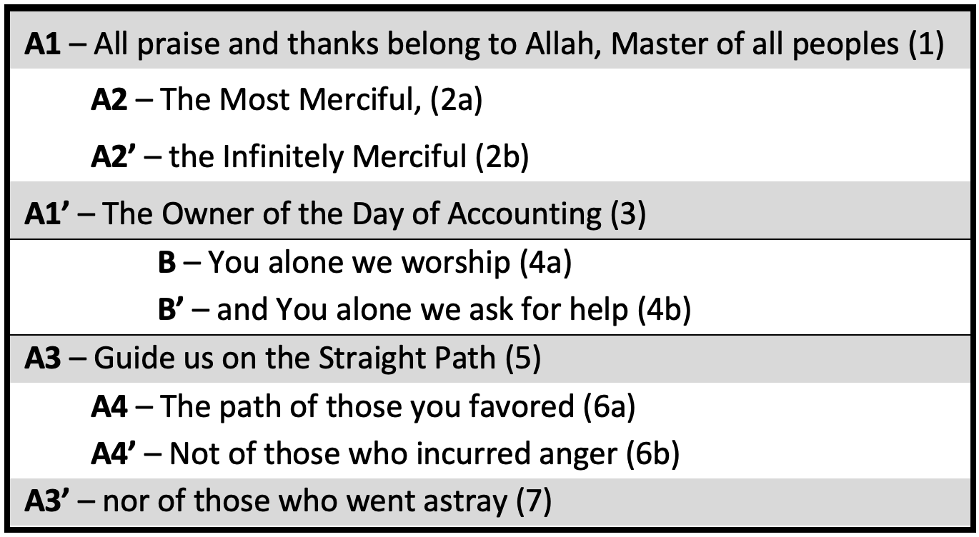 Thus, we see that Sūrat al-Fātiḥah has a concentric structure, consisting of two corresponding outlying parts - themselves consisting of smaller rings - that enclose a central part relating to them both.