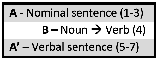 As mentioned earlier, Section [A] is one continuous sentence. Of particular note is that it is a sentence that begins with a noun, which makes it a nominal sentence7. In contrast, the final sentence, Section [A’], begins with a verb and is therefore a verbal sentence8.