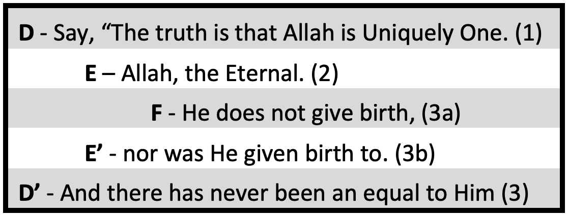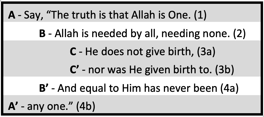 The sūrah begins with the central call of Islam; Allah ﷻ is “One”, unique in His singularity [A]. This is in contrast to the lowercase “one” being referenced at the end of the sūrah who is simply one of many lesser beings [A’].