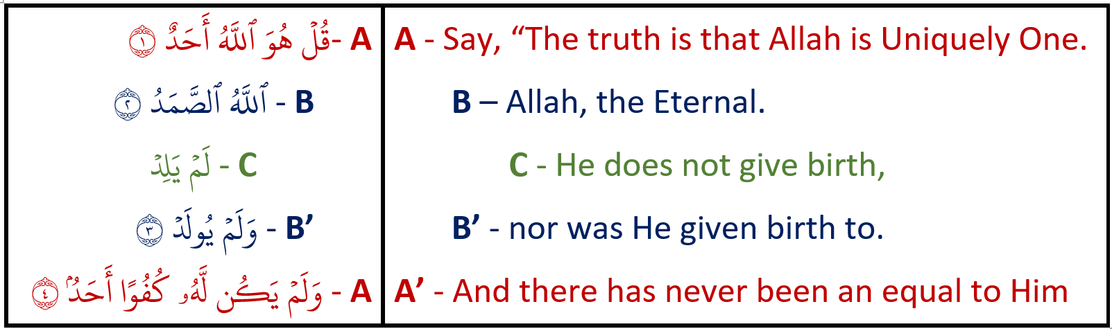 Following the declaration of monotheism, Allah ﷻ informs us that He is needed by all, while at the same time, needing no one else [B]. Unlike Allah ﷻ, all of creation can never be equal to Him with our deficiencies and needs [B’]."
