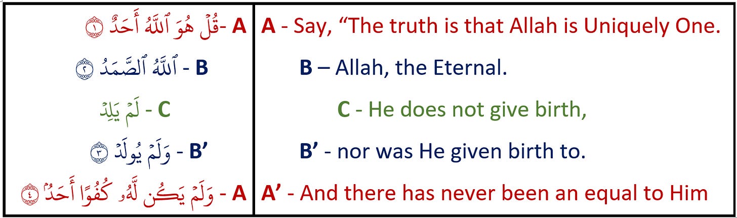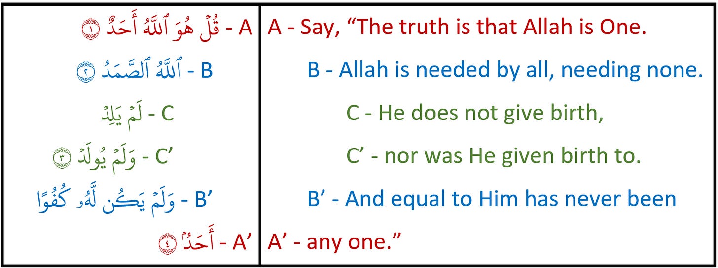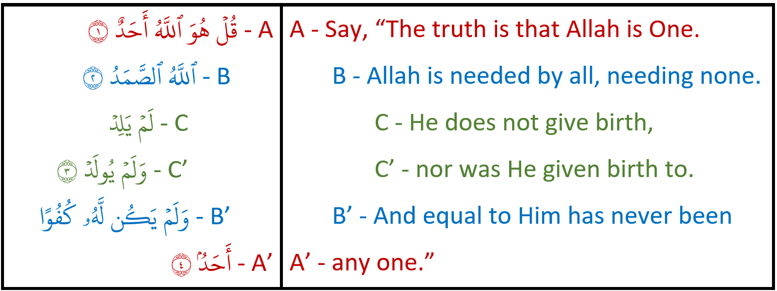 Many months ago, we published a post on the ring structure of Sūrah al-Ikhlāṣ. One of our readers, Omer Abid, commented with their own thoughts on the structuring which we thought were worth sharing. Abid proposed an alternate ring structure to the one we presented, but we actually think it’s better than our original.