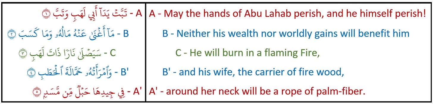 The sūrah begins with the immediate condemnation of the uncle of the Messenger ﷺ, Abu Lahab (A). On the opposite end of the sūrah (A’) lies the condemnation and punishment for Abu Lahab’s disbelieving wife. In the case of Abu Lahab, Allah ﷻ mentions his "hands” and for the wife, her “neck.”