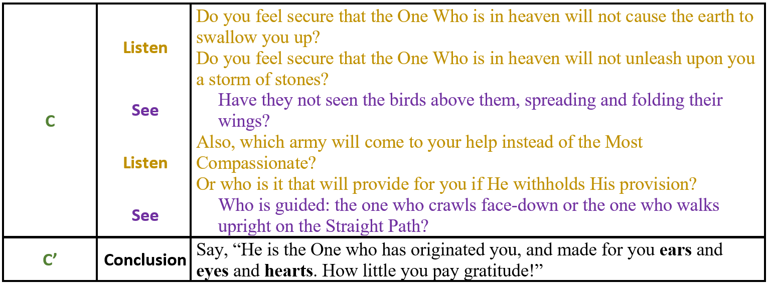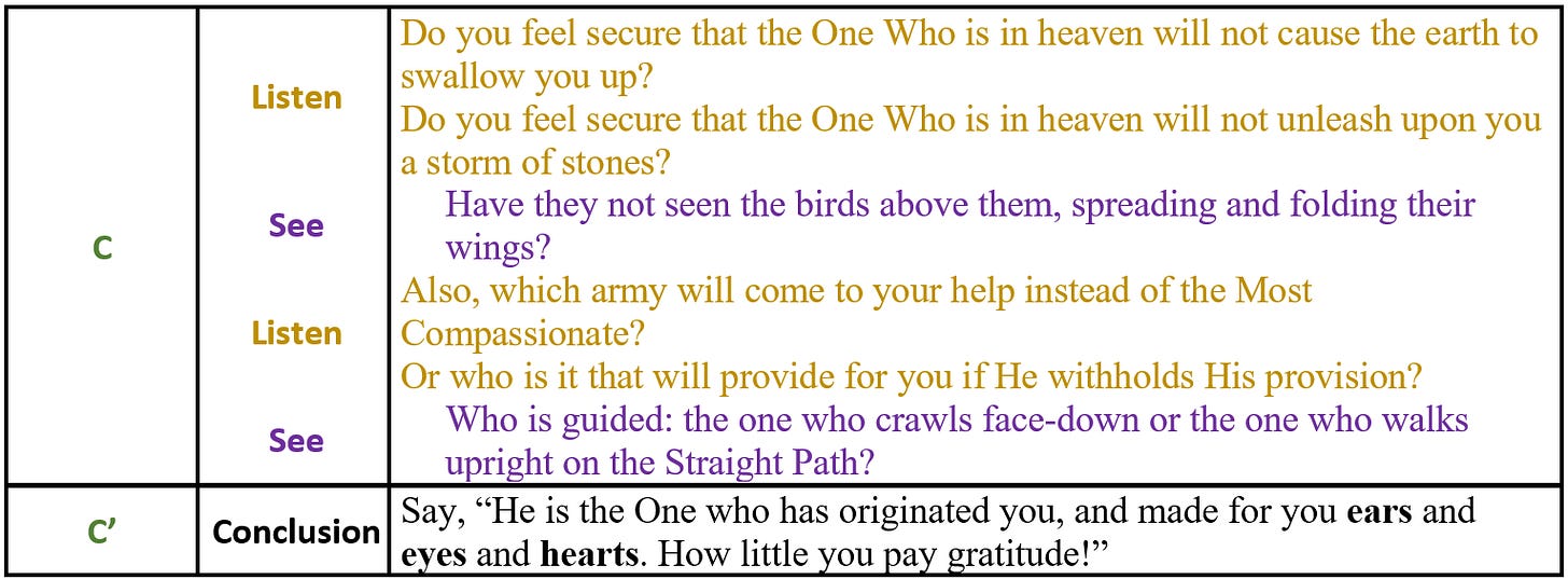 One who heeds these warnings should be affected in their heart. Section C’ immediately follows this up with, “Say, ‘He is the One who has originated you, and made for you ears and eyes and hearts. How little you pay gratitude!’” In other words, “I already gave you all the faculties you needed to benefit from this reminder.”