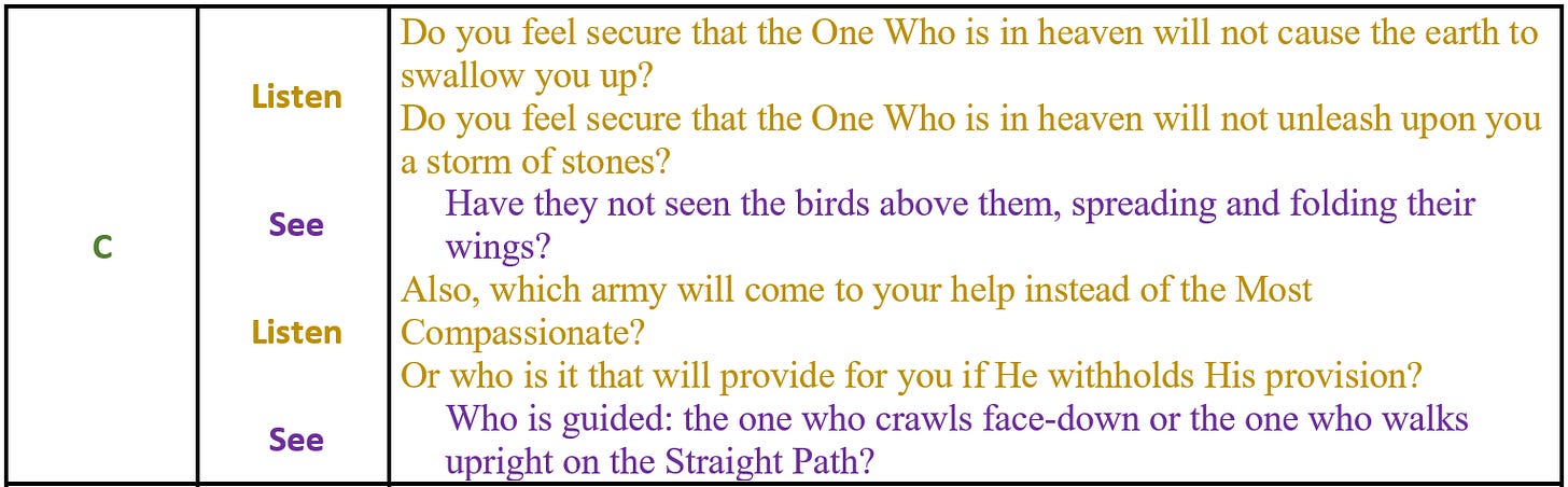 If we go through the questions Allah ﷻ brings in C, we will find an interesting trend. First He asks two hypotheticals; “Do you feel secure that the One Who is in heaven will not cause the earth to swallow you up?” and “Do you feel secure that the One Who is in heaven will not unleash upon you a storm of stones?” As hypotheticals, these questions are asking us to listen closely to the warnings.