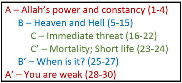Section B details Heaven and Hell and reminds us of our inevitable resurrection. Section B’ then quotes the arrogant disbelievers as they ask, “When is this promise, if you were being truthful?”.