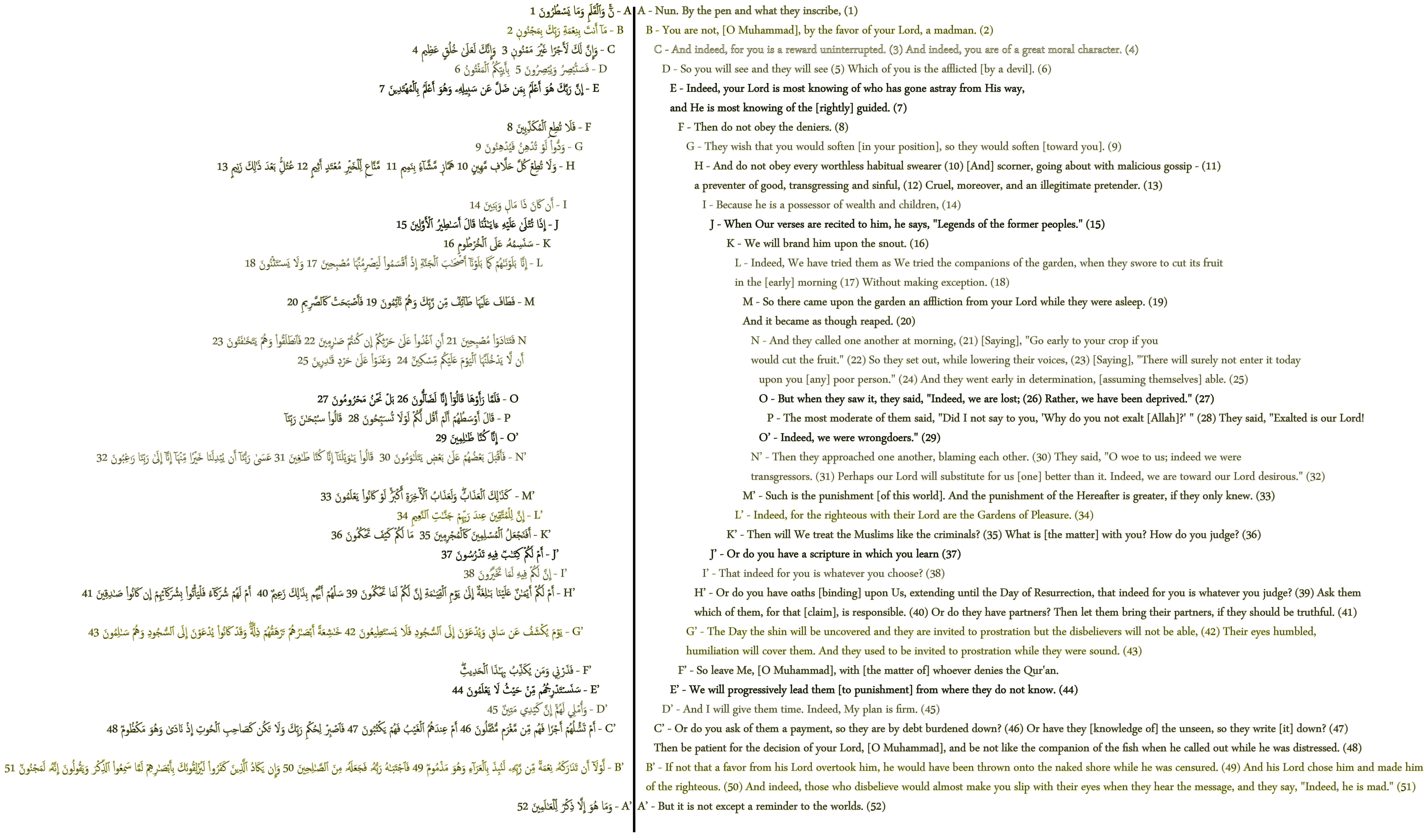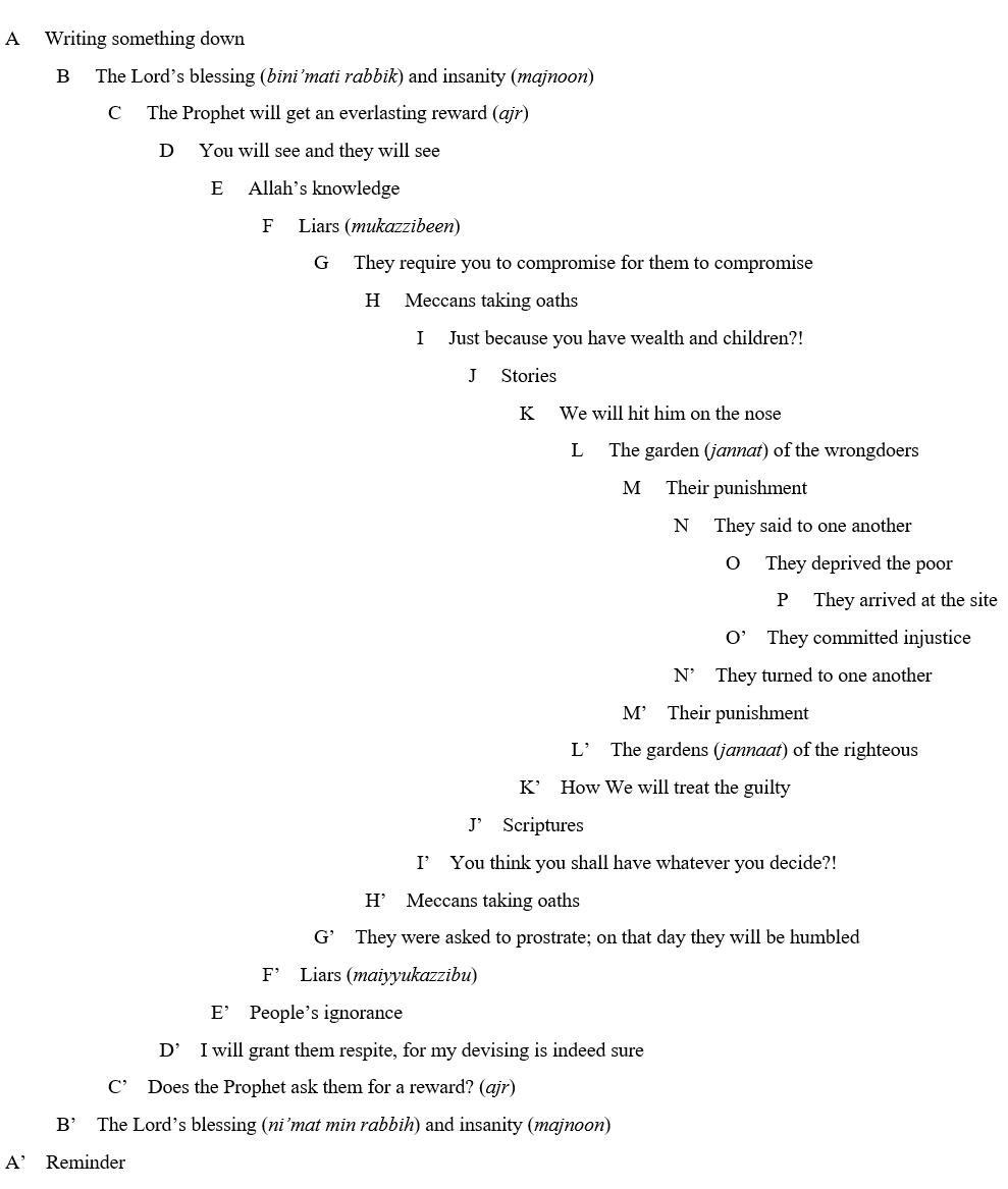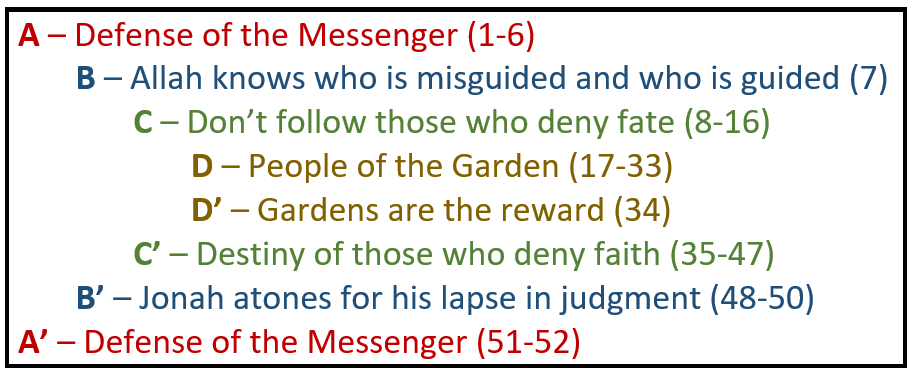 Last Friday, we looked at the structure, organization and cohesion of Sūrah al-Qalam (The Pen). Below is how we arrived at that structure.