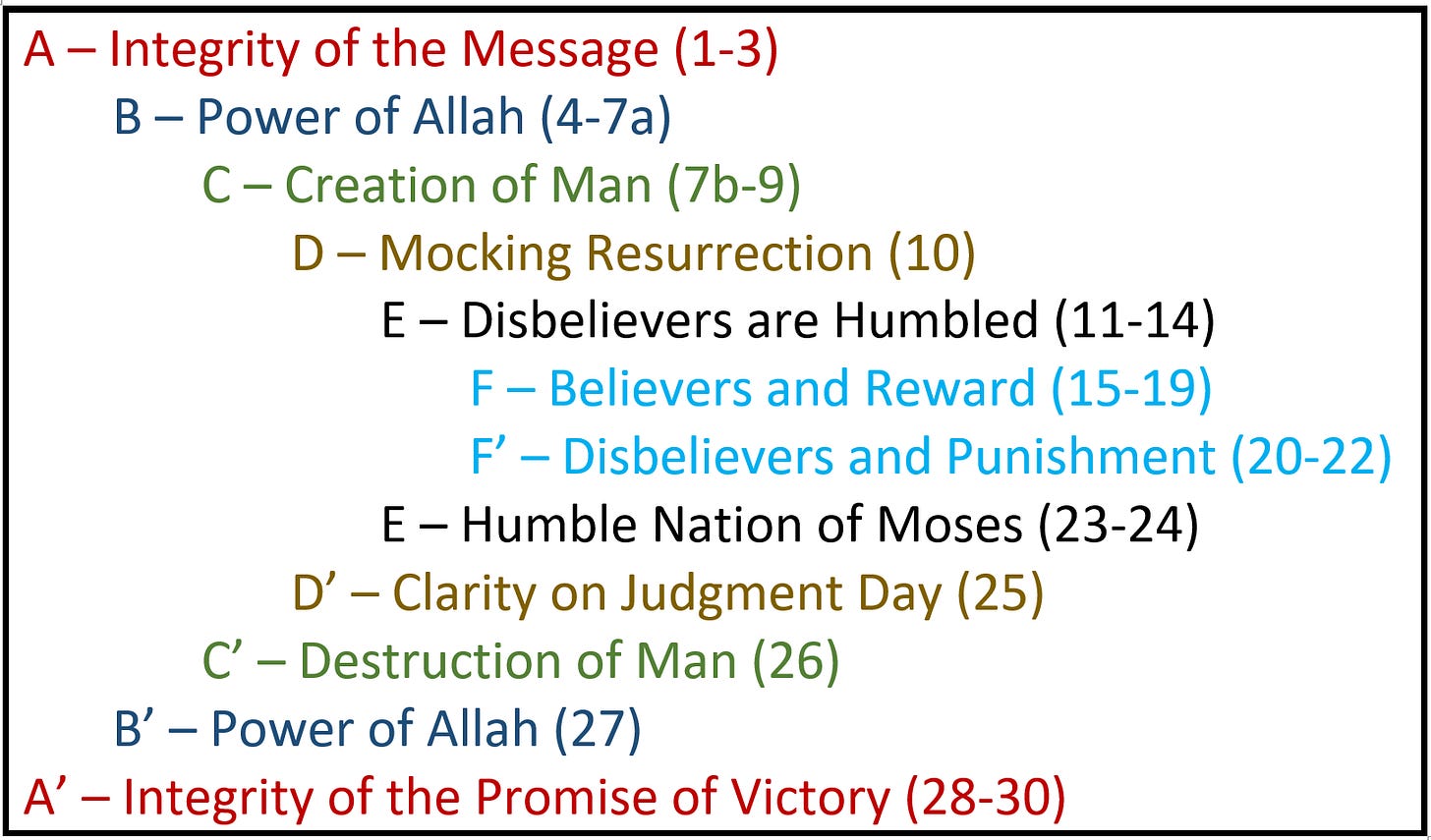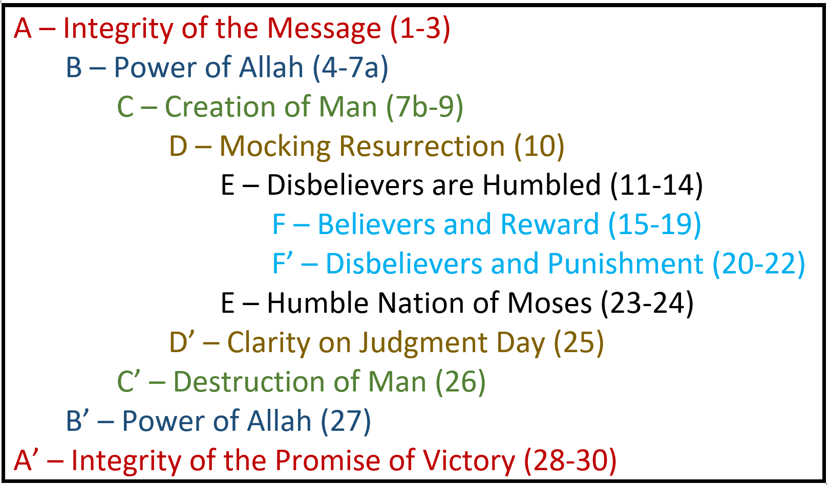 [F/F’] - The center of the sūrah focuses on the consequences of belief versus disbelief. [F] highlights the rewards for believing and striving to worship while [F’] outlines the punishment in store for those who reject faith.