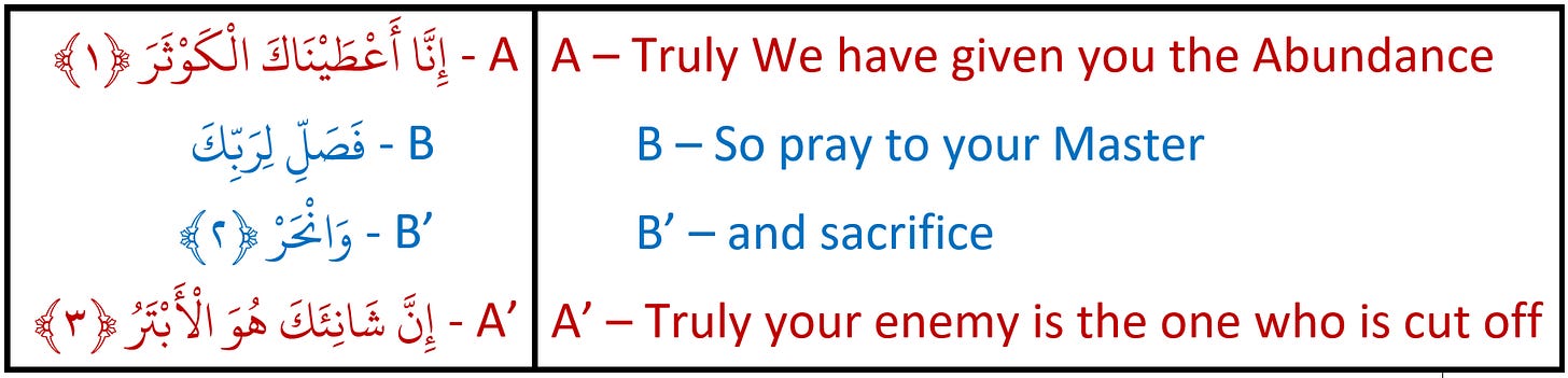 In the center, the Messenger ﷺ is commanded to express his gratitude to Allah ﷻ through two actions; prayer and sacrifice—the two modes of worship most directly associated with the legacy of Abraham—just as the Quraysh were ordered to “worship the Master of this House” in Sūrah 106.