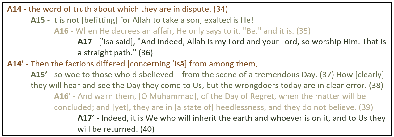 [A14/A14’] - The structure begins with a declarative statement about ʿĪsā as it is his account “about which they are in dispute.” The parallel āyah begins along the same vein mentioning that “the factions differed [concerning 'Īsā].”