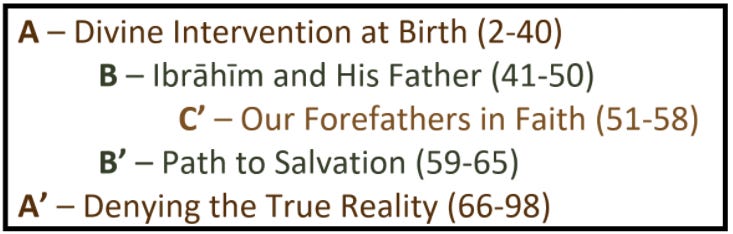 [B/B’] - The story of Ibrāhīm and his father appears to be paired with the Section outlining the path to salvation. Just as Ibrāhīm gave his father irrefutable arguments and rationale for accepting Islam, Section [B’] clearly demonstrates the options one has when confronted with the choice between guidance and misguidance. Put another way, Section [B] tells us why we should accept guidance and Section [B’] tells us the outcome of that choice (or lack thereof).