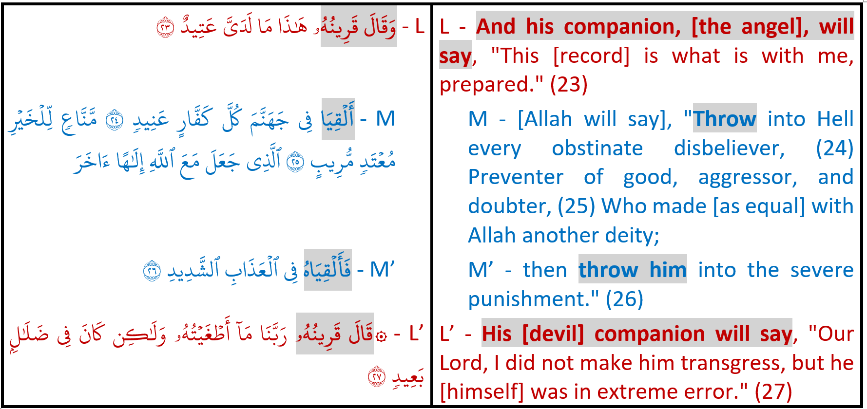 In the middle are the statements of the Qareen (close companion). On the one hand he’ll advocate for you to go to Hell (C) and on the other there is a Qareen that goes to Hell himself (C’).