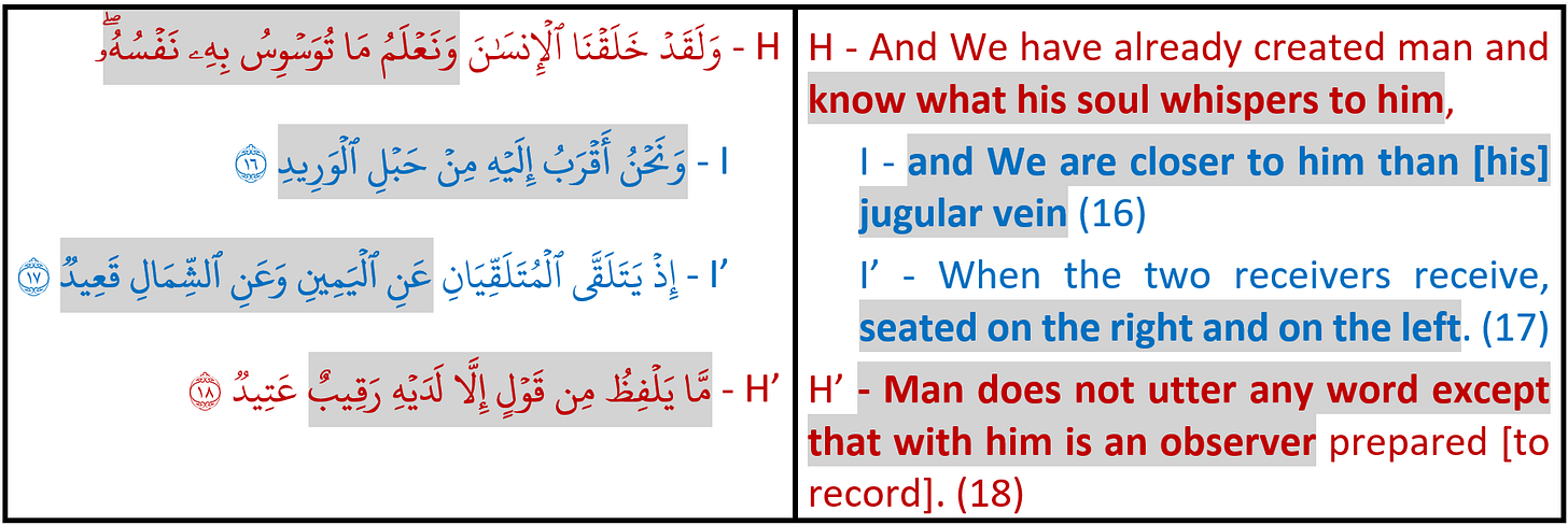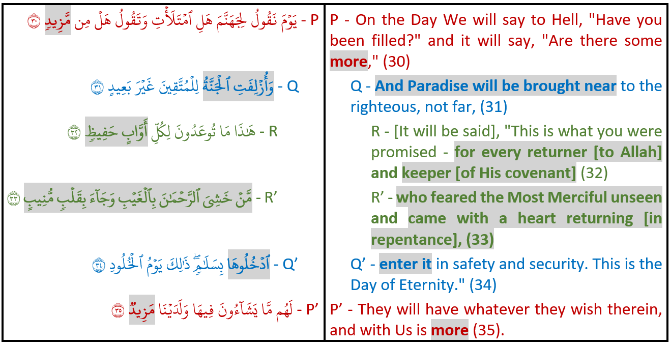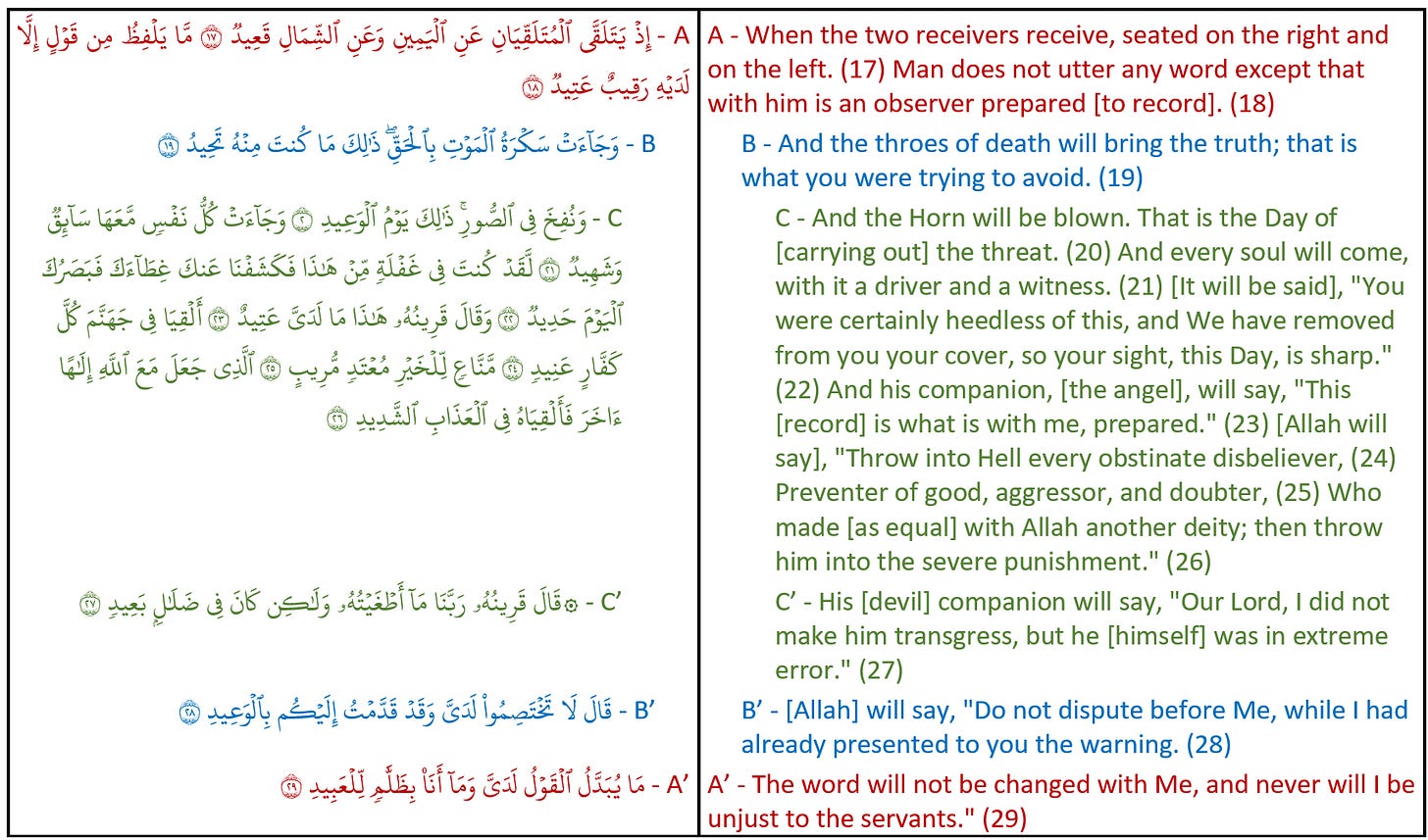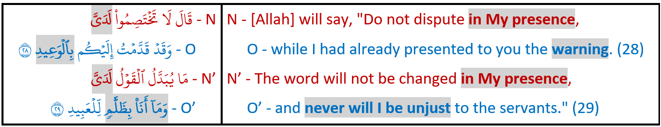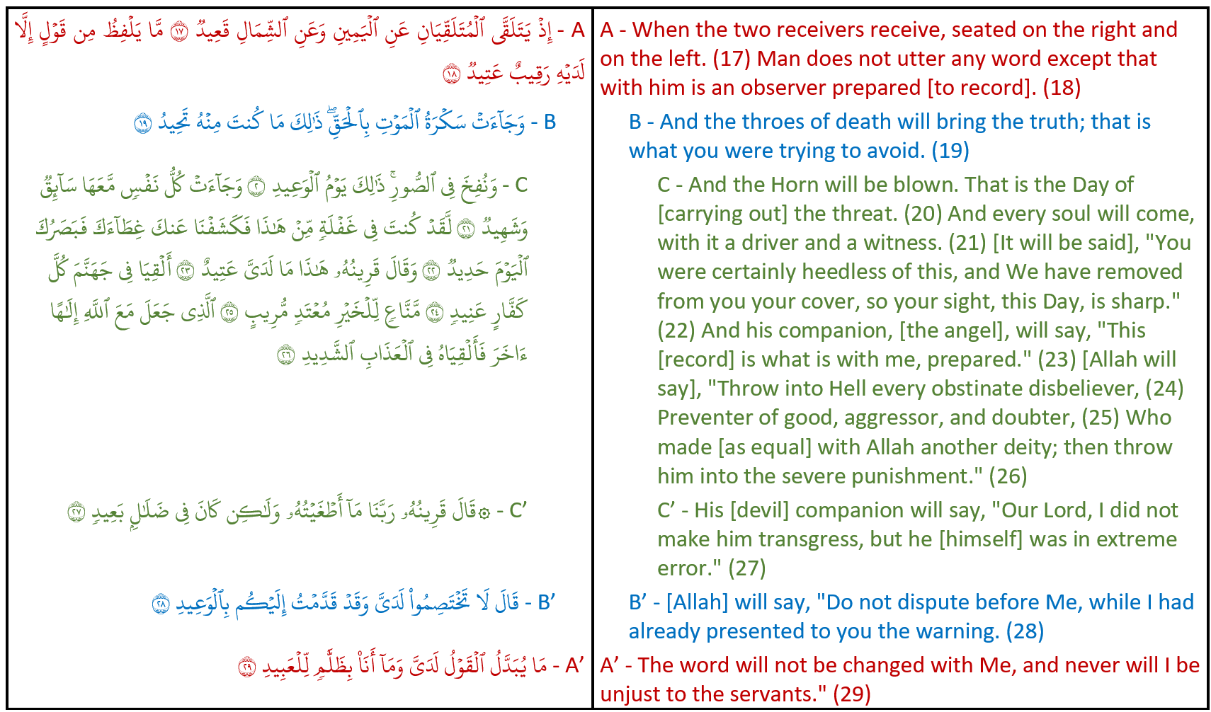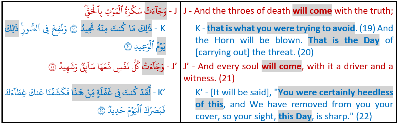 In the beginning of the surah, we were warned about death and how we had been heedless of it, and on the Day of Judgment the covers will be removed and the heedless will see. In B death comes to us, and in B’ we are told that no one will be able to argue in front of Allah ﷻ as the warning already came before death.