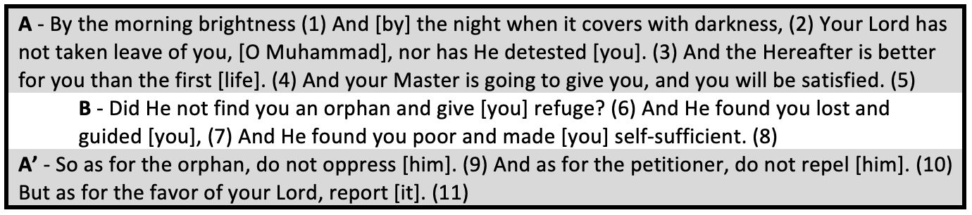 If we were to summarize the contents of Sūrat aḍ-Ḍuḥā, it seems that it forms a small ring structure: