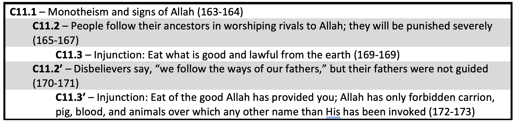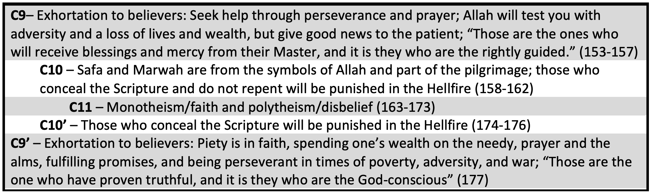 Earlier, the Muslims were reminded of the legacy of Prophet Abraham, but now Allah ﷻ reminds them that restoring Abraham’s legacy is no easy task, for just like their father Abraham, they are about to be heavily tested. The section has the following ring structure whose connections have been summarized below:
