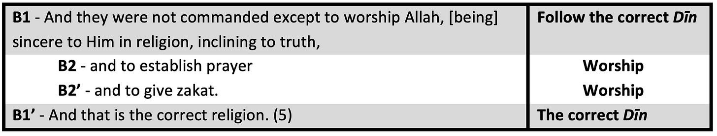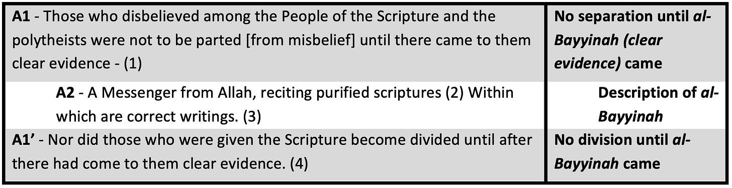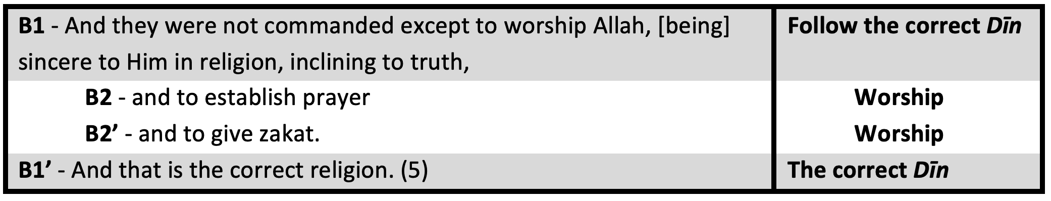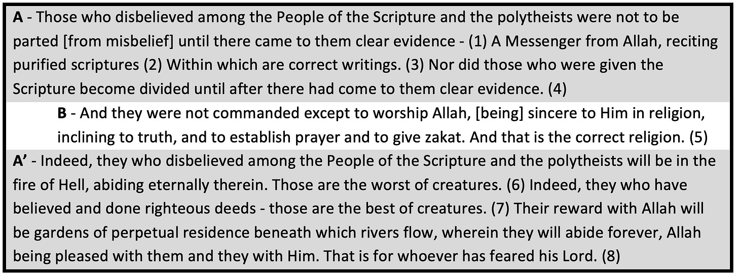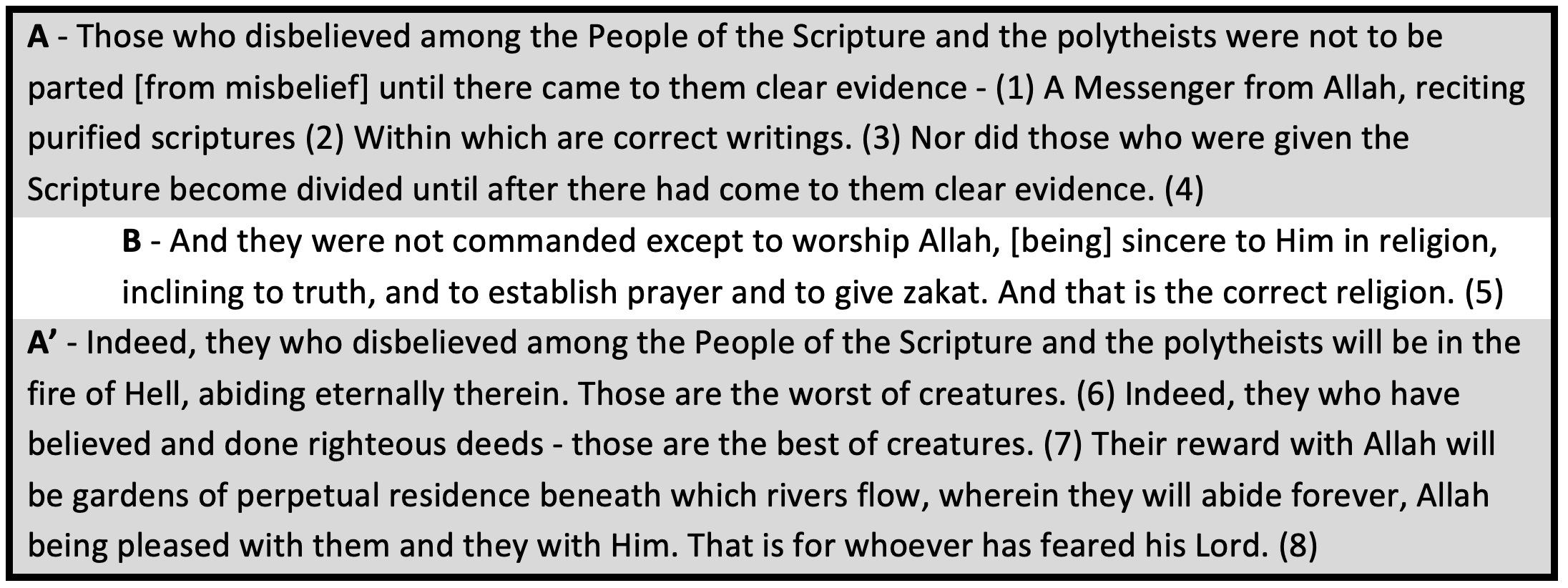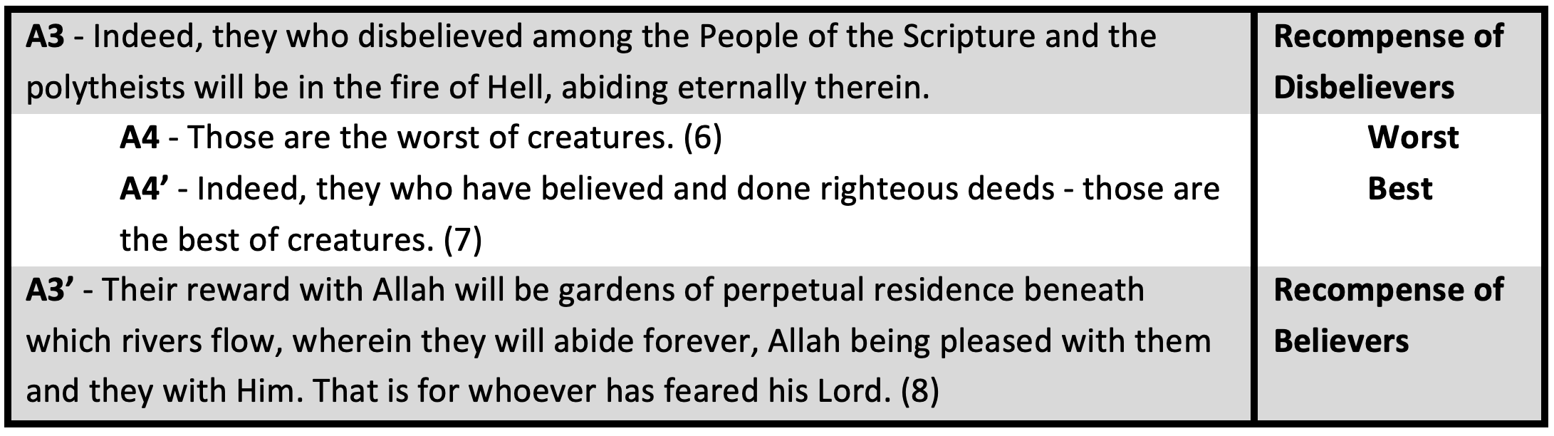 [A]/[A’] - The sūrah begins by describing the “bayyinah” which came to separate people into believers and disbelievers. The ending declares the outcomes for people on either side of that division. Those who disbelieved in the face of clear evidence are labeled as the “worst of creatures (sharrul bariyyah),” while those who chose to believe and act on that belief are labeled as “the best of creatures (khayrul bariyyah).”