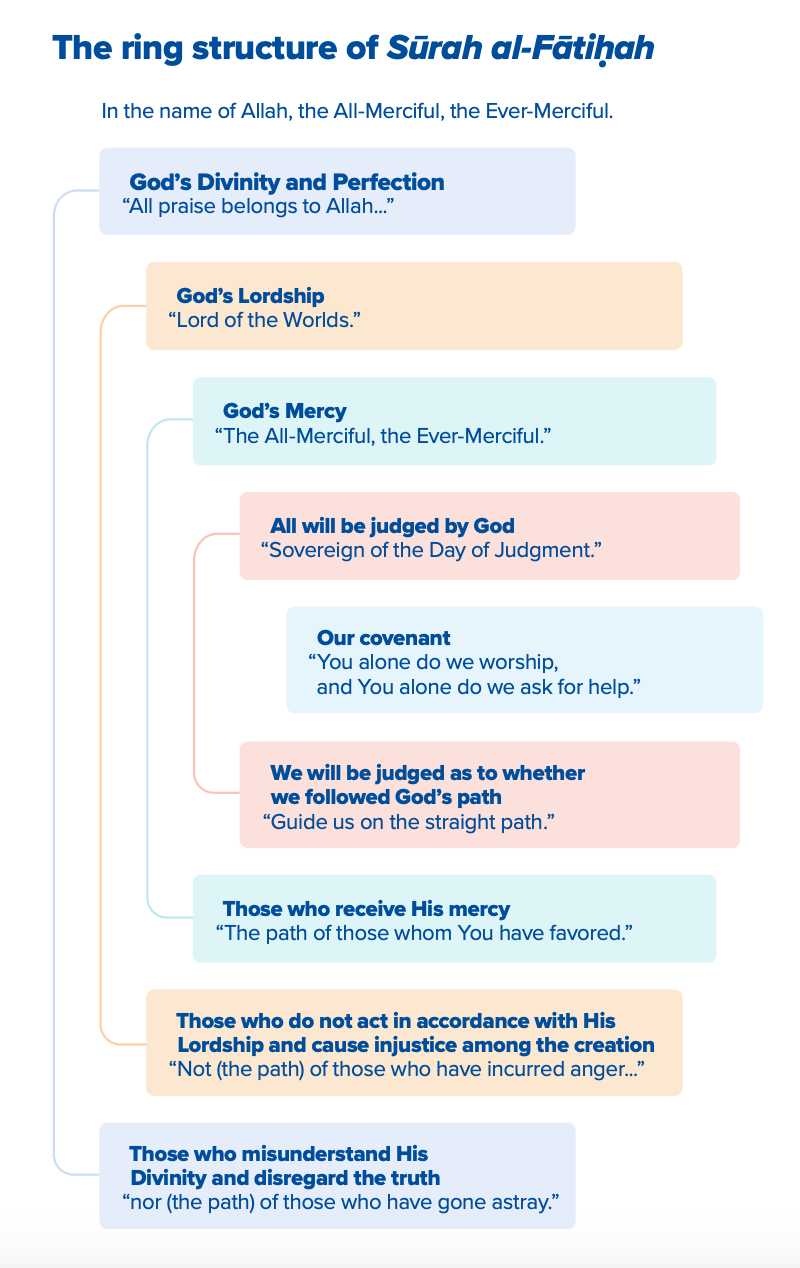 Dr. Khan shows that Sūrat al-Fātiḥah can be demonstrated to be a ring structure. The following graphic is taken straight from the paper, and it explains its connections in bold.1