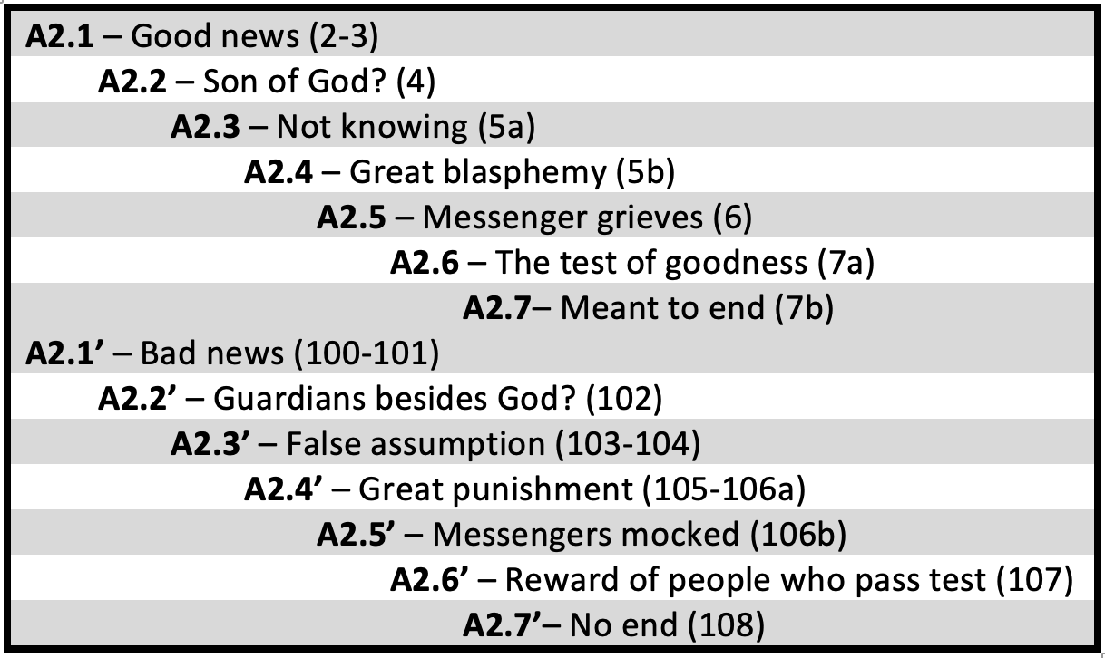 [A2.2]/[A2.2’] – Both halves place blame on those misattributing qualities to Allah ﷻ. In the earlier section, they claim that Allah ﷻ has a son, while in that latter they claim guardianship from those other than Allah ﷻ. These reflect two sides of the same issue.
