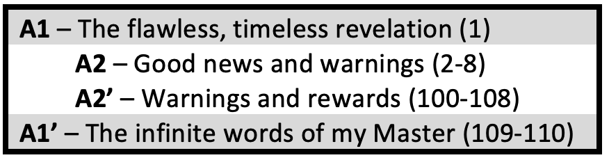 [A1]/[A1’] – Allah ﷻ begins with the “revelation” which He sent down to His “slave,” Muhammad ﷺ. The ending two āyāt have callbacks to the Quran and the Messenger’s human status when He mentions the endless ocean of wisdom found in Allah’s word, as well as the Messenger ﷺ being commanded to say, "I am only a man like you, to whom has been revealed that your god is one God.”
