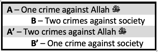 The first half mentions one crime against Allah ﷻ (denying Judgment Day) and two crimes against society (rejecting orphans and poor people). The second half mentions the opposite number, with two crimes against Allah ﷻ (heedlessness in prayer and showing off in it) and one crime against society (refusing to do even the smallest acts of kindness).