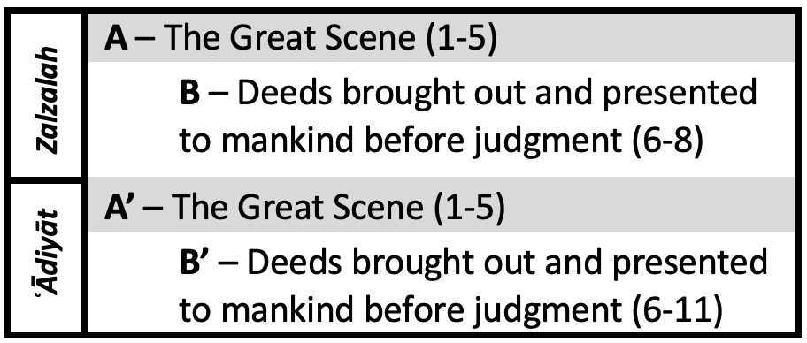 [A]/[A’] – Both suwar begin with very illustrative and shocking scenes. Sūrat az-Zalzalah details the Earth spilling its secrets and burdens as it shakes with such an intensity that mankind begins asking, “What’s wrong with it!” Sūrat al-ʿĀdiyāt begins with an even more vivid description as it gives a scene-by-scene breakdown of a raid as it rains down on an unsuspecting enemy.